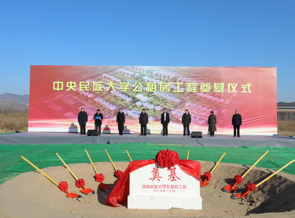 校党委副书记、校长黄泰岩宣布中央民族大学公租房建设工程奠基,参加奠基仪式的校领导和嘉宾共同走到奠基石前,手握铁锹,为教职工公租房培土奠基。各职能部门和校属单位主要负责人、各二级党组织负责人、施工单位、管理公司领导及青年教职工代表约300人共同见证这一历史时刻。
