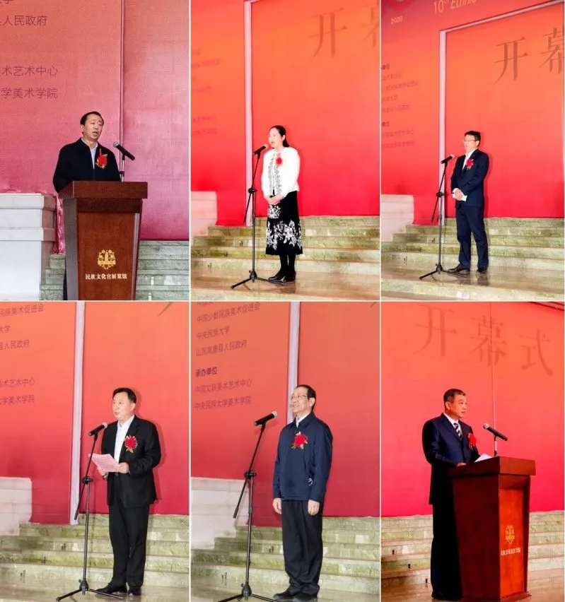 出席今天活动的领导和嘉宾还有原文化部副部长艾青春、中国少数民族美术促进会会长陆耀儒、国家民委文化宣传司副司长张剑辉、民族文化宫副主任们发延、中央美院党委副书记王晓琳、中国文联美术艺术中心副主任李伟、中国美协展览处处长董竟成、中央美院非遗研究中心主任乔晓光、《美术》杂志主编尚辉、中央民族大学美术学院党总支书记陈刚、副院长李贵男、龚东林、胡文会、中国少数民族美术促进会名誉会长郭正英、副会长鲍凤林、李辉,监事长姚宝珍、秘书长彭燕秋、展览部主任林建寿、高唐县政协主席臧立邦、《美术报》副社长吴重生、中国人民大学教授庄孔韶、中央美院教授秦璞、北京理工大学设计与艺术学院院长杨建明、北京工业大学艺术设计学院书记黄韬、北京工业大学艺术设计学院院长邹锋、北京印刷学院设计与艺术学院院长张晓东、内蒙古民族大学美术学院院长包格日乐吐、延边大学美术学院院长金真一、北方民族大学设计艺术学院院长王占河、河北民族师范学院院长芦春梅、北京龙翔永泰公司董事长宋占忠、北京稻香花海公司董事长王海清、高唐丹青公司董事长邹海涛、北京希埃希建筑设计院院长孙奇昌、中国书画收藏家协会副会长刘殿林、中国文化报原副社长杨开金、荣宝斋副总、荣宝斋画院院长唐辉院长、第十届民族百花奖获奖代表徐明磊等各界嘉宾共计200余人出席了今天的开幕式。